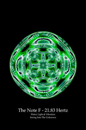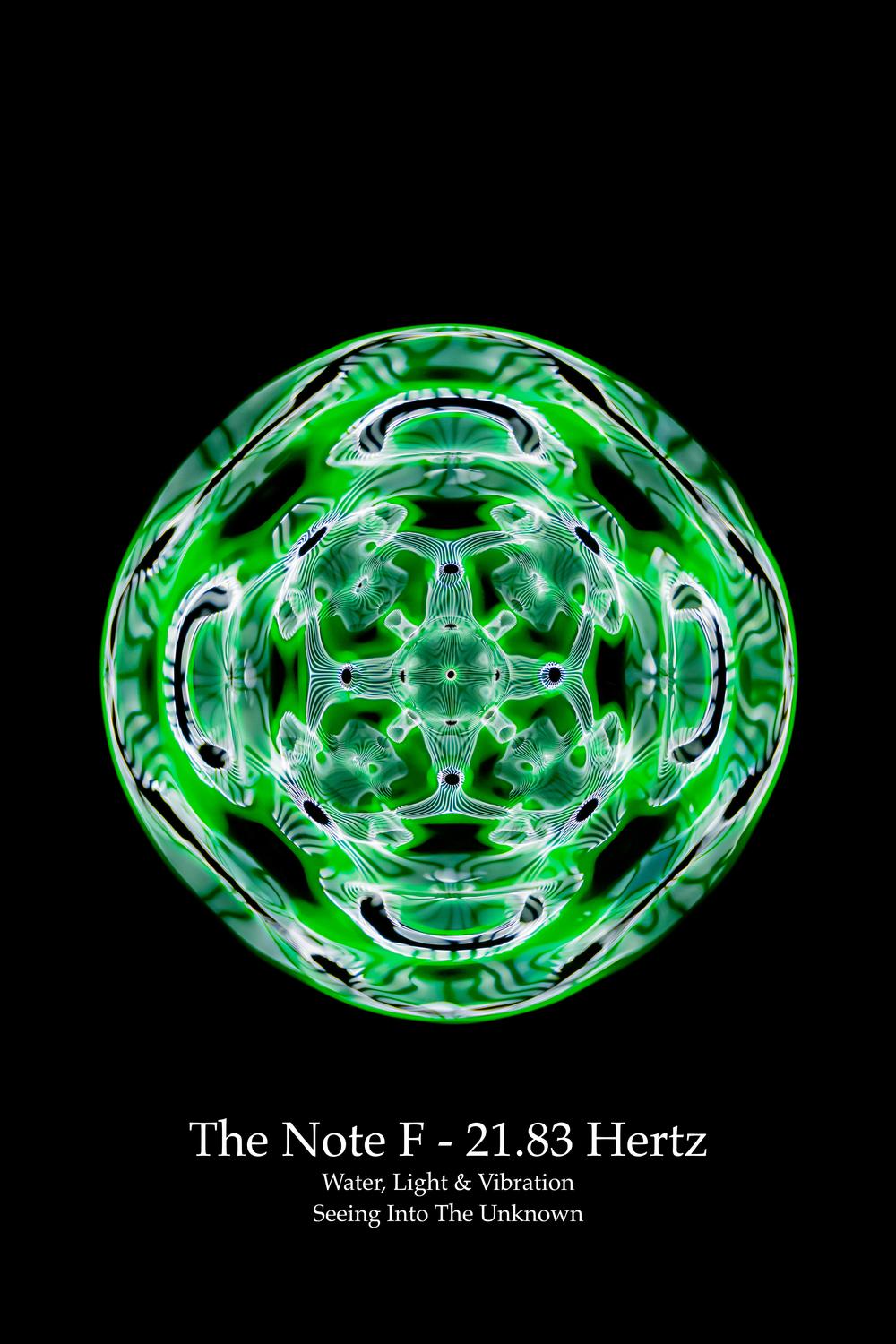 This photo was captured using a dish of water, vibrating to 21.83 hertz, with lights shining down on it.